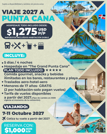 Reserva con $1,000 MXN Por persona- y ve pagando en abonos desde $300 mxn por semana hasta la fecha de tu viaje. (No cancelable, no reembolsable) págalo poco a poco! Mensual - Quincenal o semanal! Tu decides cuando y cuánto